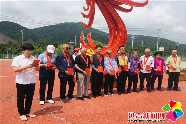 在五凤村广场,全体党员面对鲜红的党旗,高举右拳,重温入党誓词,回顾入党的初心和使命。社区党总支为9名老党员颁发并佩戴“光荣在党50年” 纪念章,感谢老党员们多年的贡献,希望老党员们保重身体,继续为社区建设献言献策、发挥余热、贡献力量。