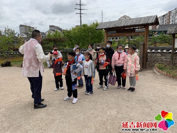伴随着车内非物质文化遗产传承人的精彩表演,孩子们跟随延边假日国旅的讲解员叔叔首先来到了民俗村进行参观,讲解员叔叔为孩子们详细的讲解了民俗村内每个建筑物的由来和历史演变。