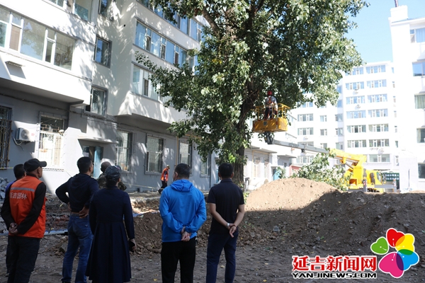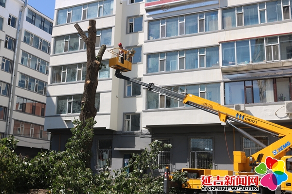 为切实解决居民反映的实际问题,文汇社区书记杨红和城建主任王亚娟第一时间到现场进行查看,大树的确到了必须修剪的程度,王亚娟同志立即打电话请延吉市园林处的同志到现场进行办公,经过社区、园林和居民的共同协商,大树修剪有了具体方案。9月2日早上7点30分,王亚娟同志早早来到园丁院,对大树附近停放的车辆进行清理,保障修剪工作顺利进行,上午8点,园林处工作人员开始施工,停车、防护、登高、修剪,有条不紊,大树树枝被锯成一段一段的,方便清理。为防止砍树时掉落的枝桠给居民造成意外损害,社区工作人员全程对过往行人和车辆做好疏导工作,保证群众生命财产安全。经过3个小时紧张有序的修剪,参天大树得到了妥善处理,安全隐患成功消除,坐在远处观看的阿姨们漏出了开心的一笑。