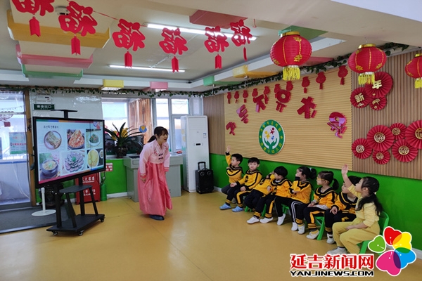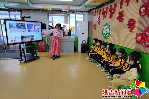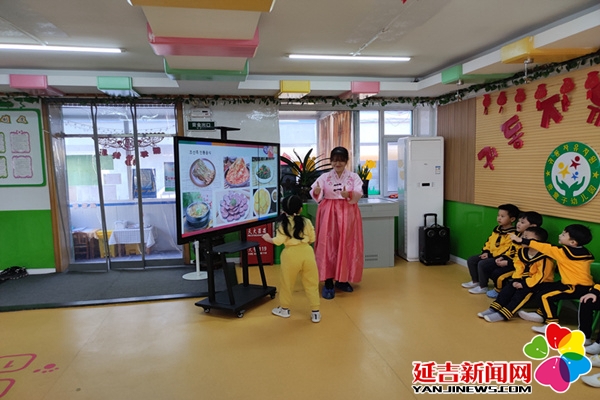 活动中,工作人员通过PPT展示,向孩子们介绍了延边朝鲜族自治州的历史沿革,并带孩子们观看延吉市的老照片,让孩子们了解家乡的变迁。随后,工作人员讲解了朝鲜族传统服装、传统美食等民俗文化,并组织朝鲜族传统饮食名称竞猜小游戏,加深了孩子们对家乡文化的认识。
