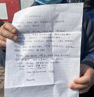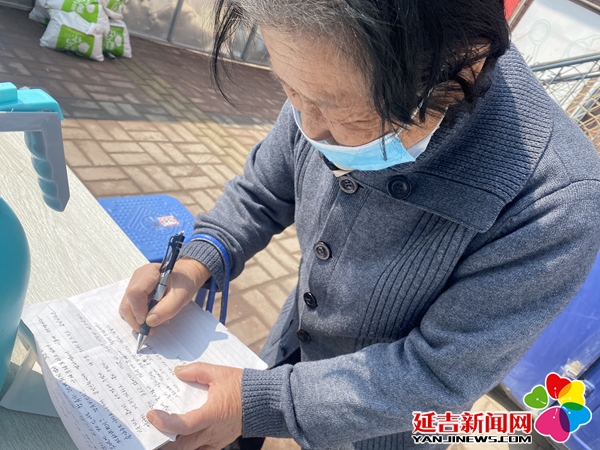 “投身于这场没有硝烟的抗疫一线战争中的你们,辛苦啦...”3月24日上午,公园街道园校社区80岁的金凤淑老人颤抖着双手,在社区疫情防控卡点值守现场写下了一封感谢信,并将感谢信塞进中国联通延边分公司党员先锋岗的工作人员手中,嘴里还不停地说着:“谢谢你们,谢谢你们,有你们真的是太好啦!”