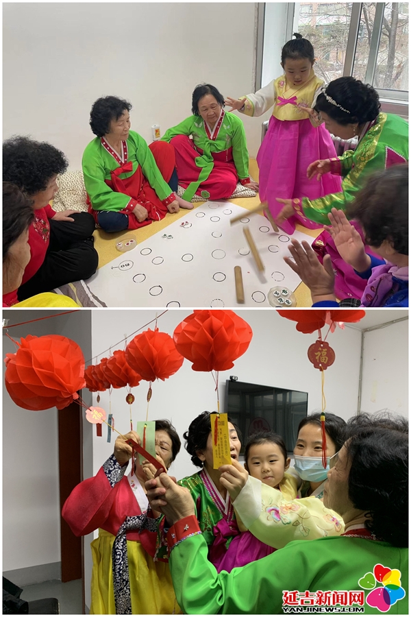 【民平】活动开始前,社区工作人员将准备好的灯笼和谜语挂在绳子上。一个个有趣通俗、内容丰富的谜语引起了社区居民们浓厚的兴趣,大家踊跃参与,随着活动的进行,谜语被确认答案的居民一一取下,整个活动现场充满了欢声笑语。最后,身着朝鲜族传统服饰的居民们进行了朝鲜族传统游戏——尤茨。现场欢笑声和掌声不断,大家都沉浸在和谐的节日氛围中,度过了一个快乐的元宵佳节。