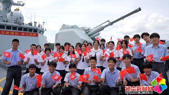 △2025年7月3日,中国海军山东舰航母编队抵达香港。香港中学生登上海军运城舰参观、留影。