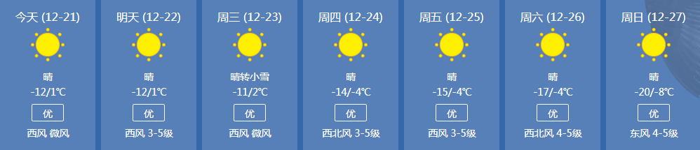 市气象局预计本周平均气温为-8.5℃左右,与常年同期相比高3.2℃左右,气温呈现前高后低趋势;全市平均降水量为1-2毫米,与常年同期相近。