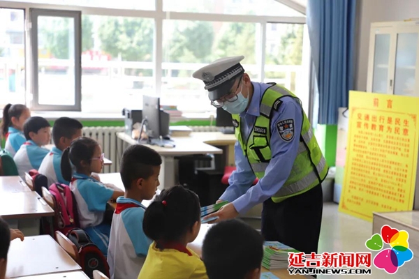 交警为学生们发放宣传读本