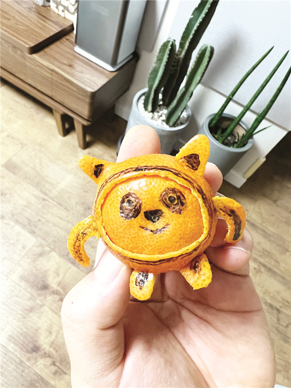 一些脑洞大开的成年人选择就地取材,不求逼真,只为博得众人一笑,以解一“墩”难求之苦。2月7日,张宗宇便跟随抖音用橘子皮弄了个“橘墩墩”,发布在微信朋友圈后,被大家称赞为“才子”。张宗宇笑称,有了这项手艺,“冰墩墩”就可以留给运动员了,祝他们在赛场上努力获取更多“金墩墩”,为国家争光。