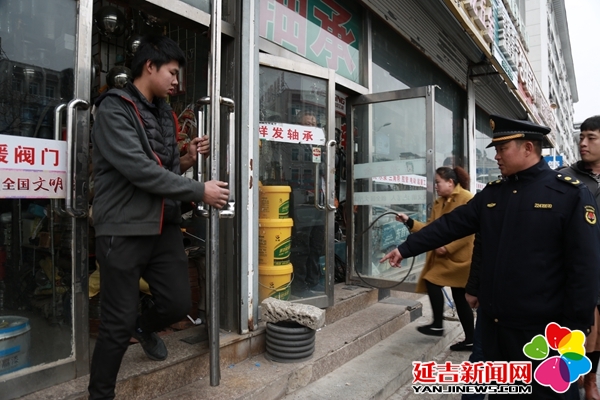 综合执法人员让商家清理门口障碍物 王晓彤 摄