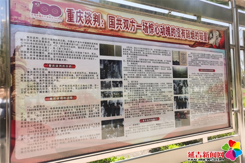 随后,朝阳川第一中学九年一班学生朗诵了“伟大的旗帜”,陈述了中国共产党走过的艰辛坎坷,歌颂了各族人民在中国共产党领导下的团结发展;全校师生共唱《没有共产党就没有新中国》,唱出了跟党走的坚定信念。活动最后,与会人员参观了“重庆谈判”为主题的宣传展板。
