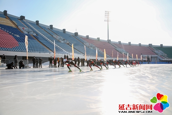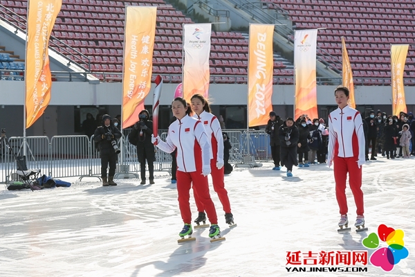 上午10时,北京2022年冬奥会火炬——“飞扬”,由1995世界短道速滑锦标赛女子3000米接力冠军张冬香、2016全国冬运会青年女子组500米速度滑冰冠军石晓璇、国家短道速滑集训队队员张珈宁3名延边籍优秀冰上运动员代表护卫,滑冰送进体育场,现场顿时响起雷鸣般的掌声。