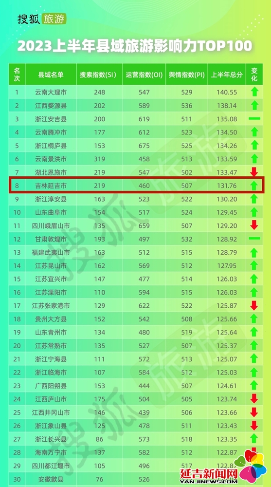 近日,搜狐旅游发布2023上半年县域旅游影响力TOP100,这是一份及时反映各地旅游影响力的“线上成绩单”,延吉跻身前十。