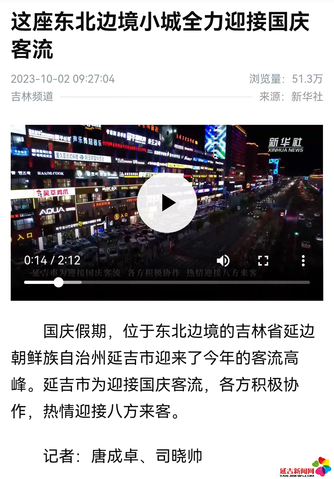 10月2日,新华社APP以“这座东北边境小城全力迎接国庆客流”为题,报道国庆假期延吉市为迎接国庆客流,各方积极协作,热情迎接八方来客。截至10月8日,新闻浏览量51.2万。