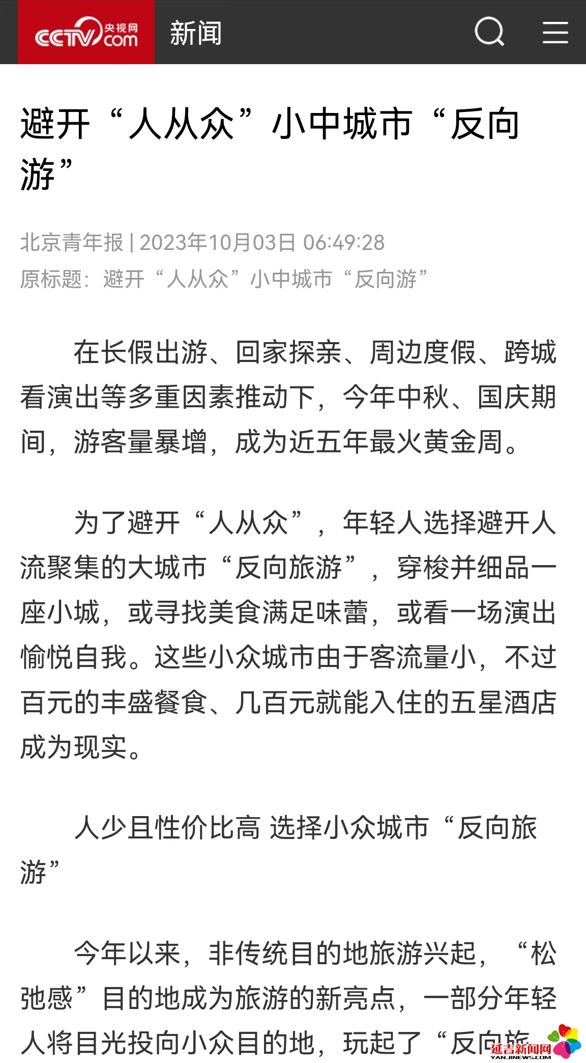 10月3日,北京青年报报道了“避开‘人从众’小中城市‘反向游’”一文,央视网对其进行了转发。报道中,延吉作为曾经的“小众城市”正在“冒头”进入游客视线,在“味蕾游”持续走红的加持下,延吉因独特美食吸引消费者探访打卡。报道数据显示,截至9月29日12点,延吉等一众美食城市的中秋国庆住宿预订量较2019年增长均超过400%。
