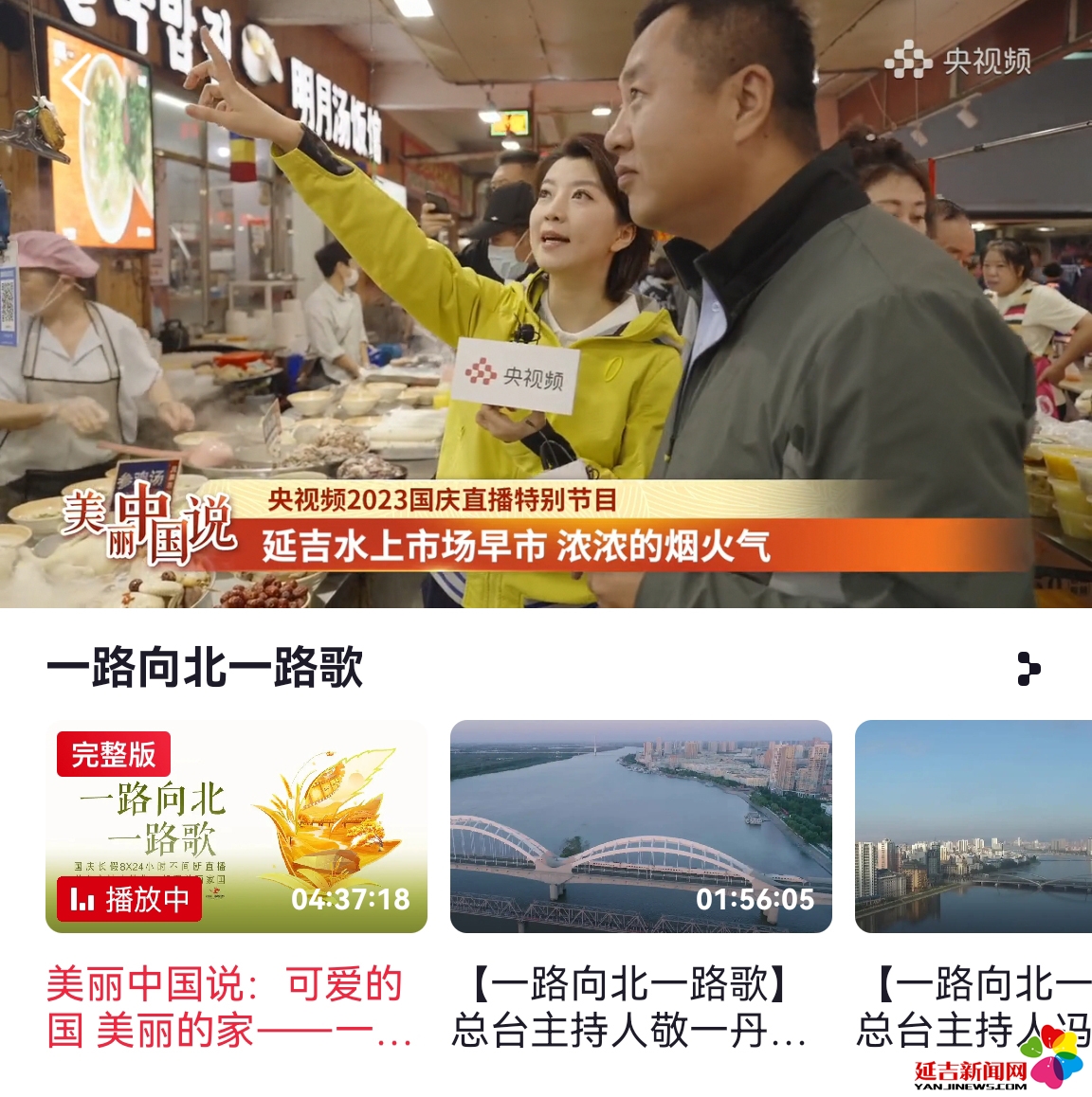 10月4日,央视频《美丽中国说:可爱的国 美丽的家》2023国庆大直播特别节目走进延吉市,30余位央视主持人带领网友一路向北,在歌声中赏如画风光,云游祖国大好河山,领略各地风土人情。在吉林板块,央视主持人体验延吉水上早市体味人间烟火气,打卡延边大学感受校园文化,探秘中国朝鲜族民俗园体验民俗文化……评论区内,广大网友纷纷表达对延吉的向往,“垂涎欲滴”“嘎嘎好吃”“朝鲜族传统民族乐器动听”“想去民俗园变装”“太精致了吧”“爱了爱了就爱了”……直播期间,央视频直播在吉林融媒、延吉融媒App、抖音、短视频等平台同步直播。截至10月8日,直播观看人次达2411.9万。
