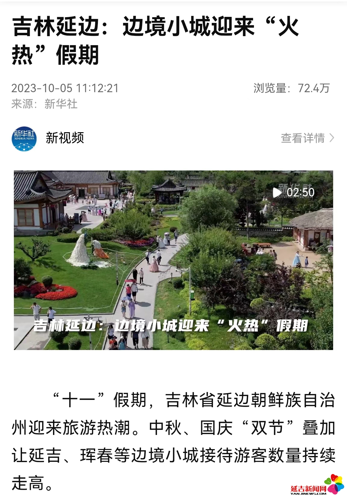 10月5日,新华社发布“吉林延边:边境小城迎来‘火热’假期”一文,报道中秋、国庆“双节”叠加让延吉等边境小城接待游客数量持续走高,并从延吉西站、餐饮行业发展,以及美妆、旅拍、民族服饰租赁等行业发展方面,展现延吉旅游热潮。截至10月8日,报道总浏览量72.4万。