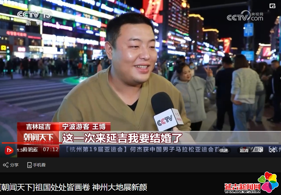 10月6日,CCTV-13《朝闻天下》栏目播出《祖国处处皆画卷 神州大地展新颜》中海采全国各地游客,其中以延大网红墙为背景采访宁波来延吉旅游的游客。