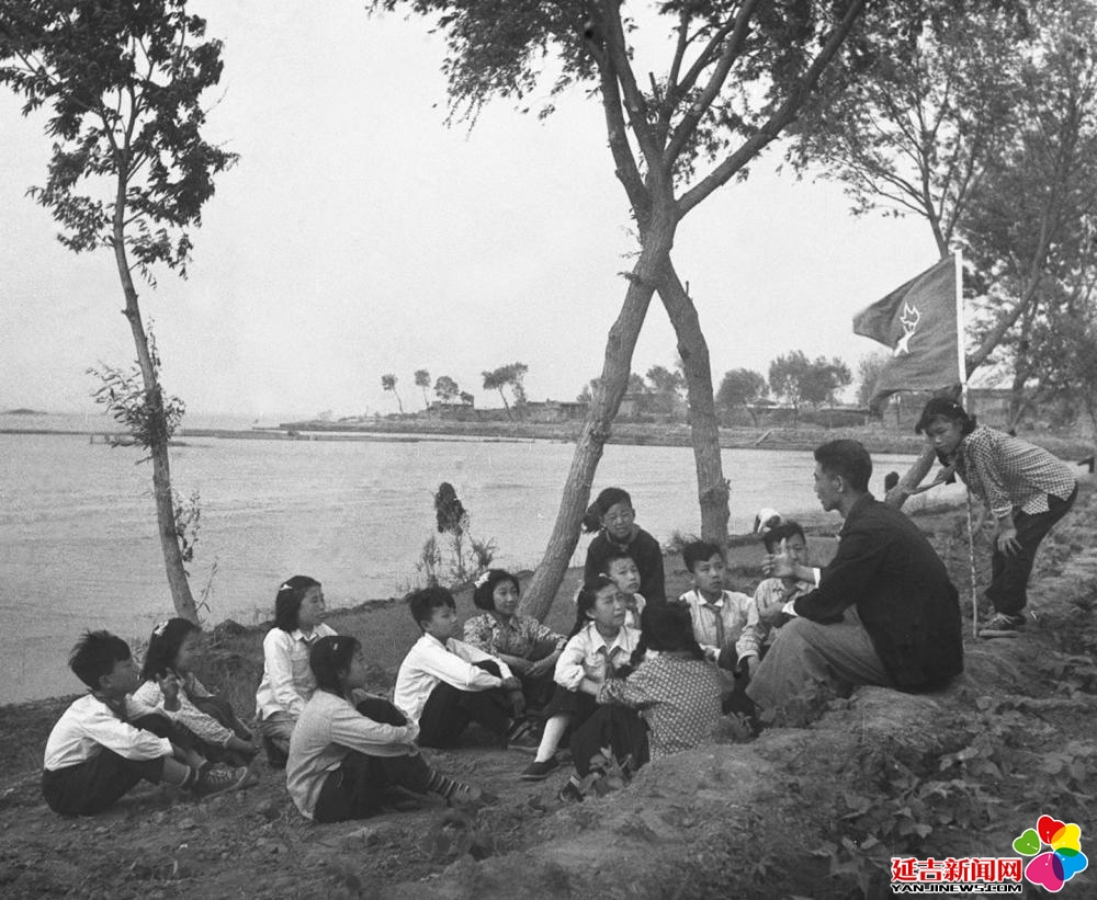 1955年,在河北白洋淀,新安小学的少先队员们听曾担任过抗战时期儿童团团长的陈殿元讲抗战故事。