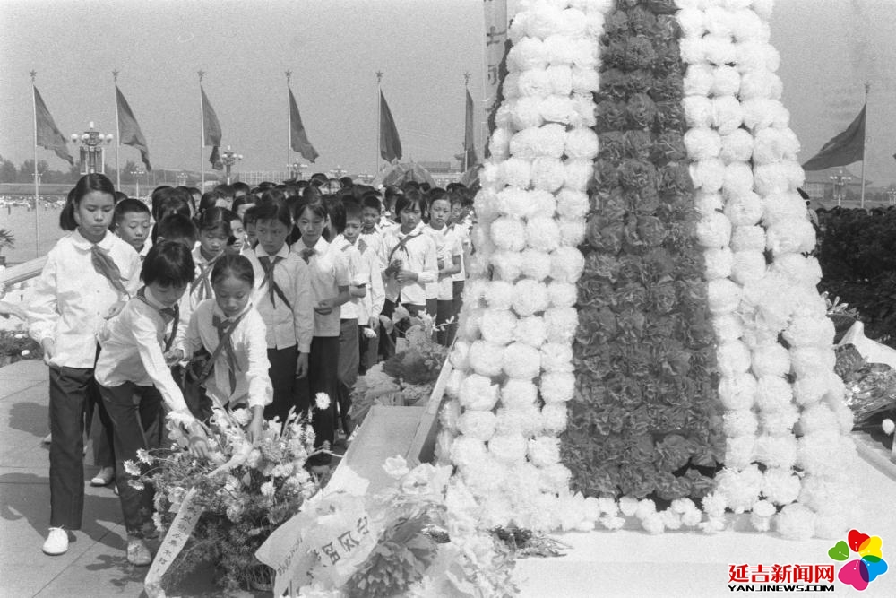1985年,首都各界代表在天安门广场人民英雄纪念碑前举行献花圈仪式,追念在抗日战争中牺牲的将士和死难同胞。这是海淀区少先队员在敬献花圈。