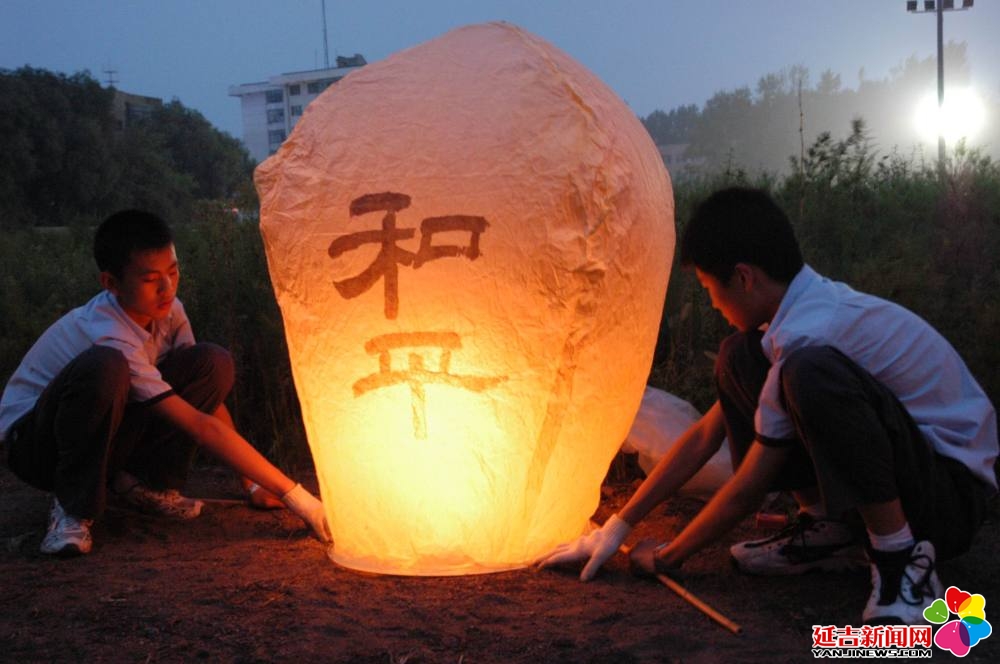 2005年8月15日,近万名各界群众聚集在哈尔滨市平房区侵华日军第七三一部队罪证陈列馆,举行祈祷和平活动。这是市民点燃孔明灯。