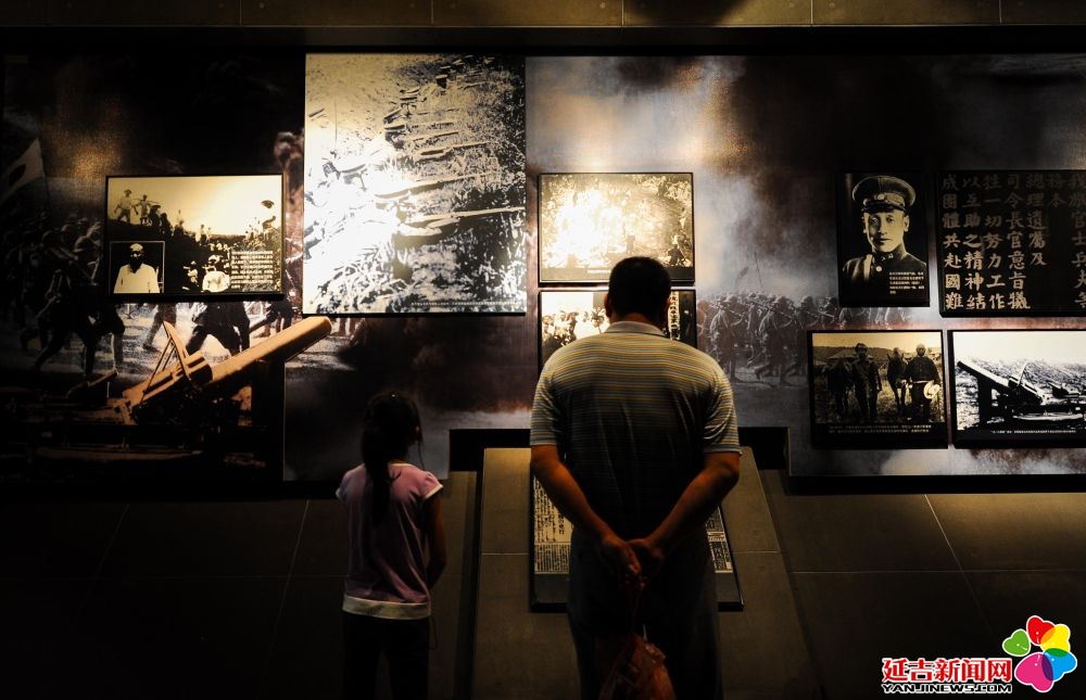 2013年8月15日,吉林省长春市各界人士来到位于伪满皇宫博物院内的东北沦陷史纪念馆,参观日本侵略中国东北史实展览,缅怀抗战英烈。这是一对父女在参观展览。