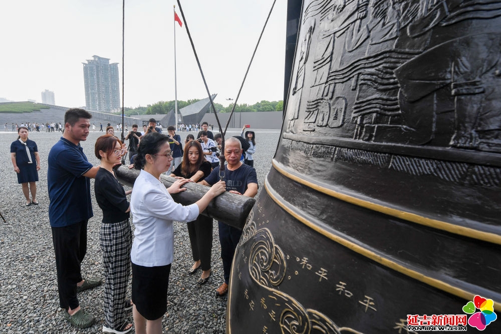2023年8月15日,南京大屠杀幸存者后代代表在侵华日军南京大屠杀遇难同胞纪念馆公祭广场撞响和平大钟,祈福和平。