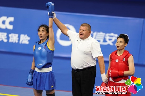 8月12日,裁判宣布中国选手李志勤(左)在武术女子散打60公斤级金牌赛获得冠军。新华社记者 陈斌 摄