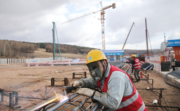 记者随项目工程主管韩加庆走进施工现场,立即被眼前的建设场景所震撼。由于连日来延吉市气温转低,加之项目所处地理位置地势较高,刺骨的寒风一阵接着一阵,但丝毫没有影响工人们热火朝天的干劲。在综合楼施工现场,工人们正通过塔吊将贴敷于地面上的保温材料一一取出,并将其叠放成捆;在水乐园施工现场,挖掘机正忙碌地平整土地,运输车来回作业;在钢筋加工场,几名工人正在进行钢筋焊接……
