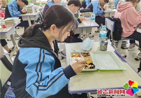 延吉市职业高级中学毕业年级一共有4个班,124名学生。开学一周以来,学生们每天早晚都是按照学校事先规定好的路线上学、放学。午餐时,由食堂工作人员将学生餐盒按时送达班级门口,各班级值日学生带好一次性医用手套后,逐一分发至每名同学,学生分别在自己的座位上用餐。饭后,会由专人将餐盒统一送至学校垃圾点。