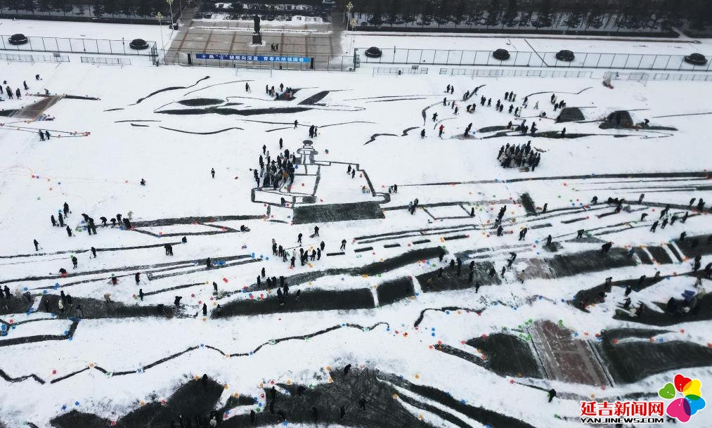 12月28日,哈尔滨工程大学师生在“绘制”“福建舰”航母雪地图案(无人机照片)。新华社发(刘洋摄)