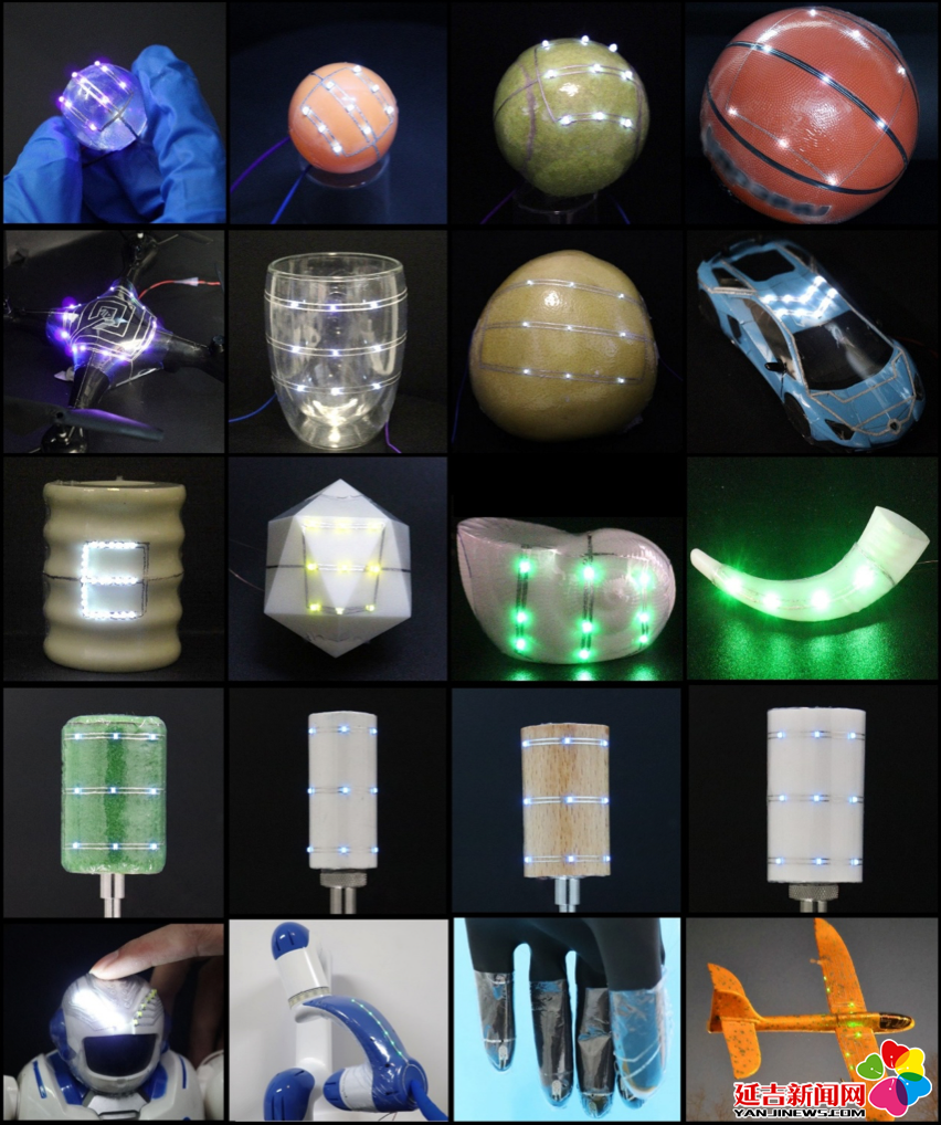 通过该技术,平面电路在约70摄氏度的温水或热风处理后,无论是圆润的苹果、飞机的机翼,还是灵活的手指,都能按照预先设计的“变形蓝图”快速自适应贴合。