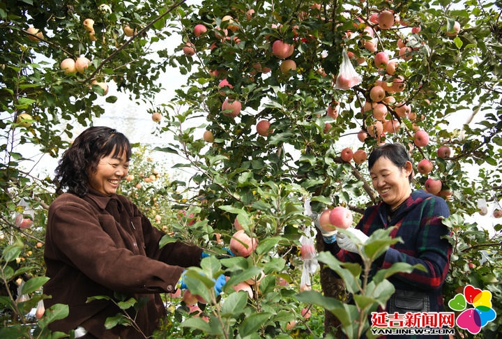 2025年10月17日,果农在陕西省延安市宝塔区桥沟街道烟洞沟村采收苹果。新华社记者 张博文 摄