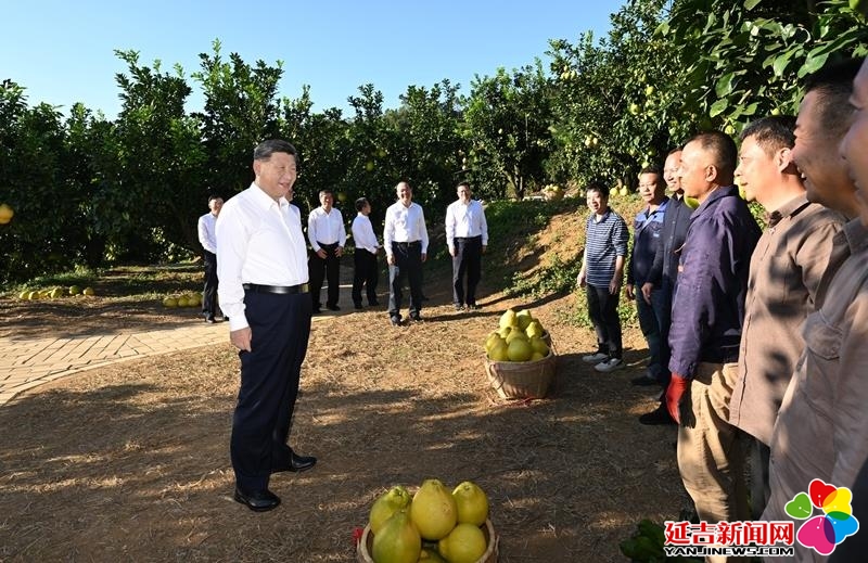△2025年11月,习近平总书记在广东梅州市雁洋镇南福金柚种植基地考察时,同果农和农技人员亲切交流。