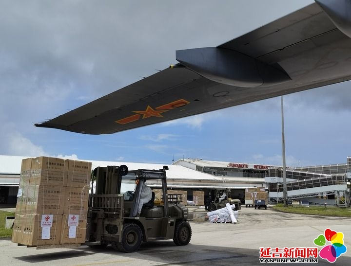 工作人员在汤加首都努库阿洛法机场卸载中国运-20飞机运送来的援助物资(2022年1月28日摄,手机照片)。新华社记者 丁增义 摄
