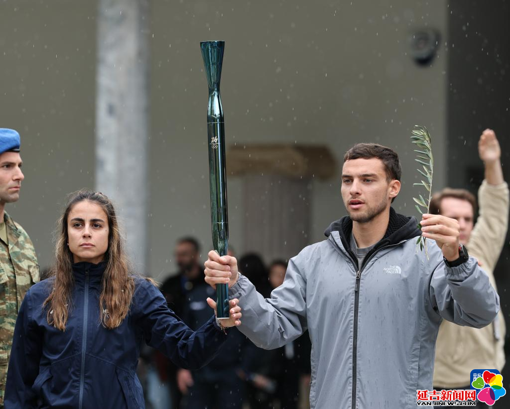 11月25日,第一棒火炬手、希腊运动员彼得罗斯(右)在彩排中。