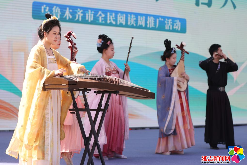 4月19日,民乐手在乌鲁木齐市全民阅读周推广活动启动仪式上演奏乐曲。