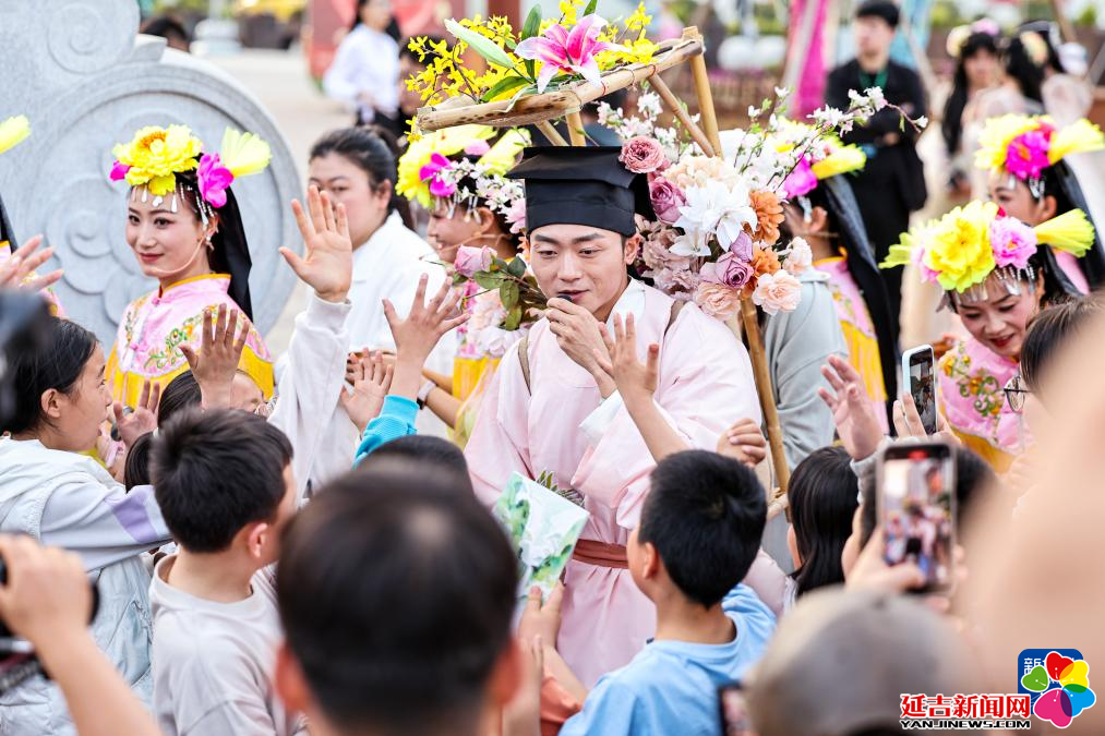 4月25日,在陇南市武都区万象街举行的沉浸式快闪活动中,演员扮演的“背花郎”与孩子们互动。