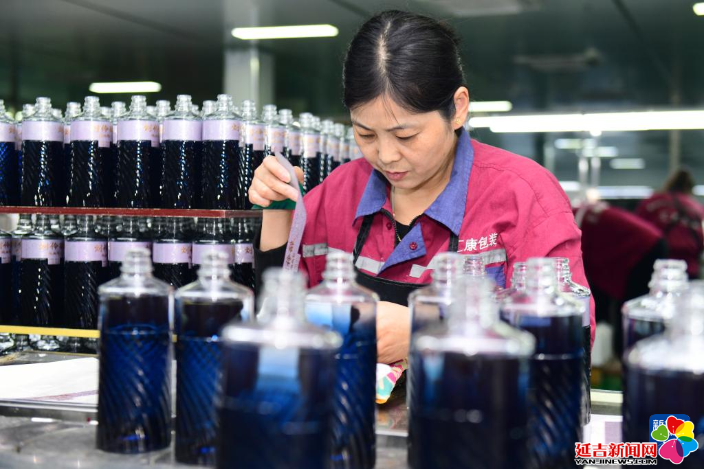 11月27日,在郓城县丁里长街道烟郓科技产业园,工作人员为酒瓶贴花。