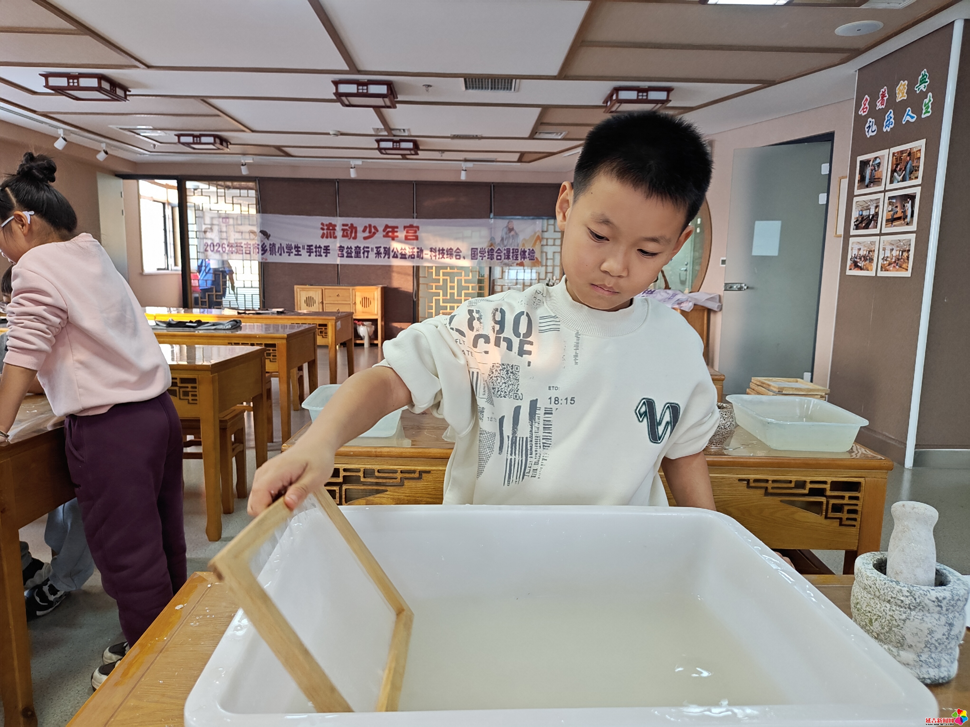 传统文化不再是书本上的静止文字,而是可闻、可触、可创造的鲜活体验。中医文化体验环节,同学们亲手制作艾草锤,直观感受中医智慧;线装书装订课程中,通过学习“四眼装订法”,体会传统技艺的精巧;皮影制作表演课堂上,灵动的皮影形象在光影交错中演绎传统戏剧;古法造纸体验里,碎纸、搅浆、抄纸……带有花草纹理的精美纸张在孩子们手中诞生,每一个环节都是与传统文化的深度对话。