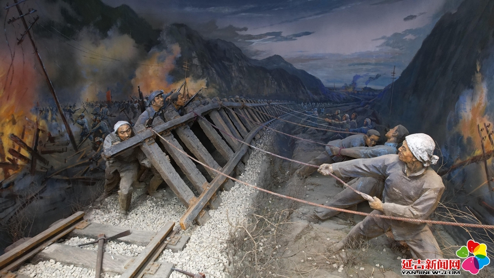 △百团大战纪念馆内展示的军民掀翻铁轨的场景。(总台央视记者范凯、裴大伟拍摄)