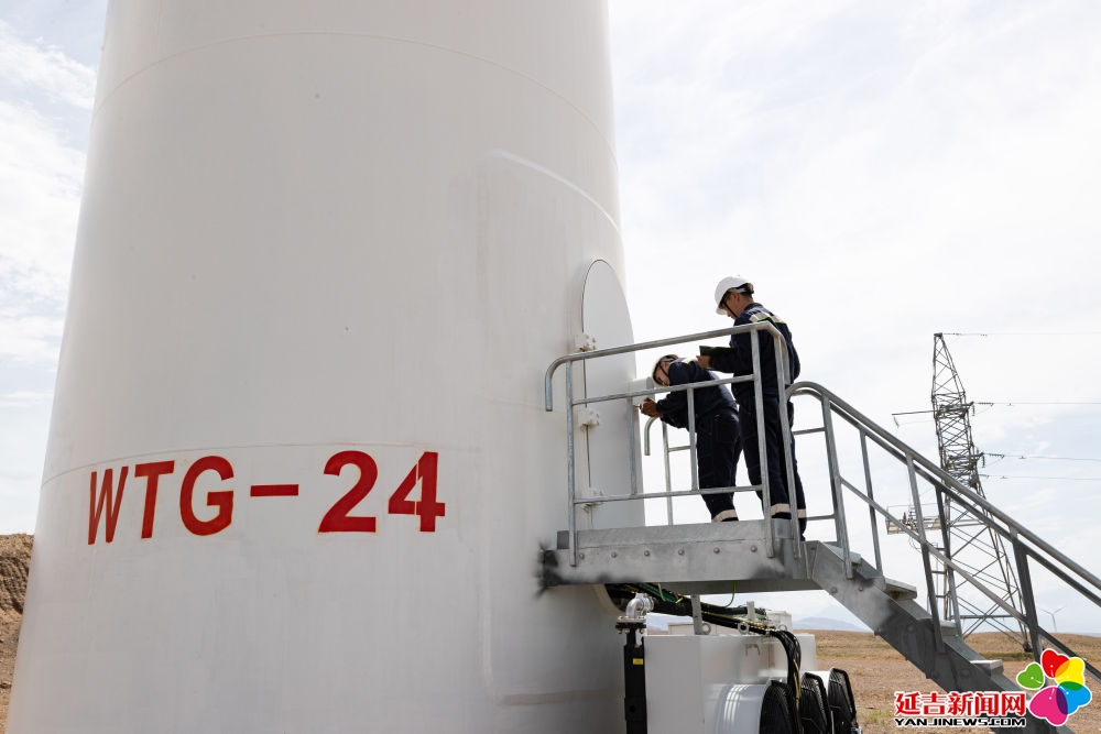 2024年6月25日,在哈萨克斯坦阿拉木图州谢列克风电场,工作人员准备打开风机塔筒门进行检查。新华社记者白雪骐摄