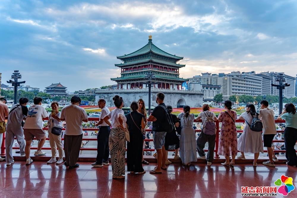 △游客在陕西西安市碑林区钟楼景区拍照打卡。