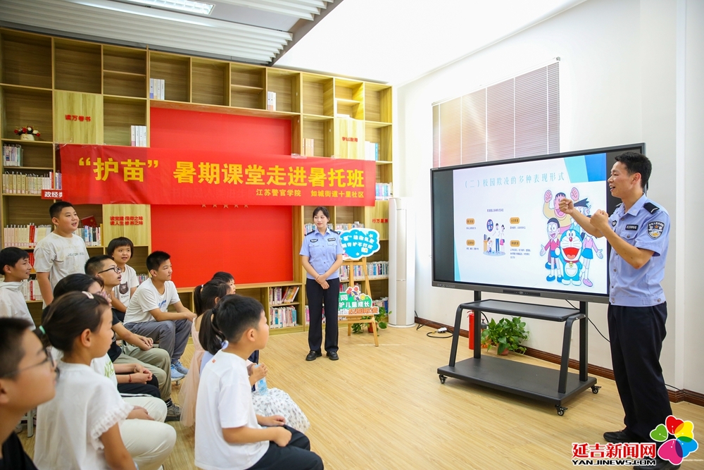 2025年7月8日,江苏警官学院“社区微警校”品牌教育暑期服务项目走进江苏省如皋市如城街道十里社区暑托班,为孩子们带来“拒绝校园欺凌”暑期法治安全讲座。