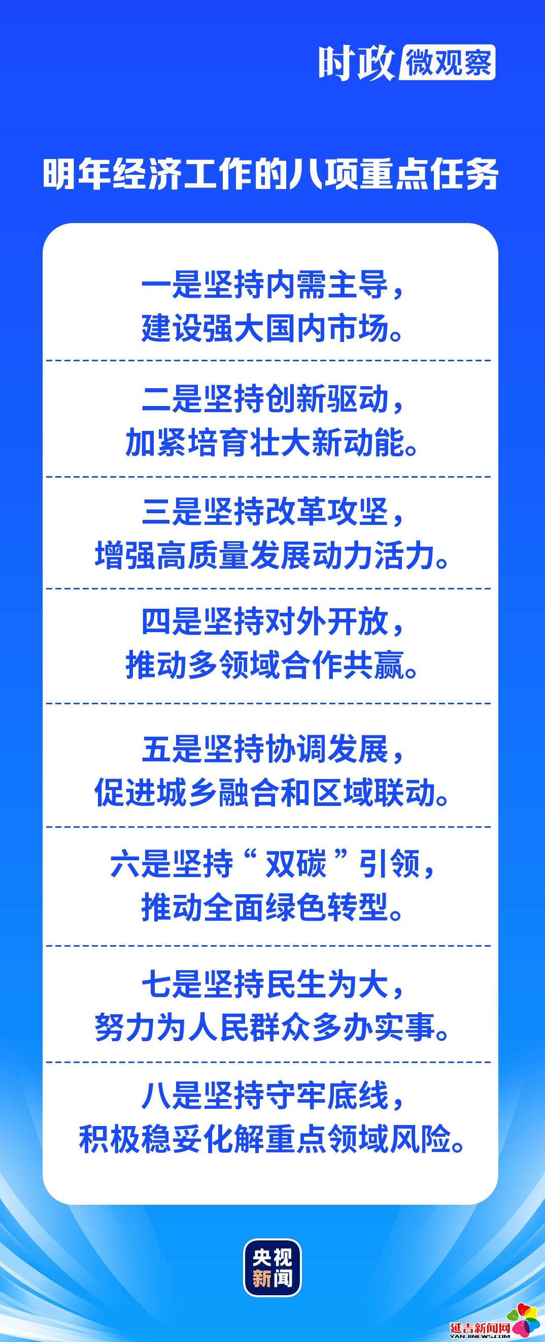 此次中央经济工作会议确定的明年经济工作重点任务,包括“坚持改革攻坚,增强高质量发展动力活力”“坚持对外开放,推动多领域合作共赢”等。