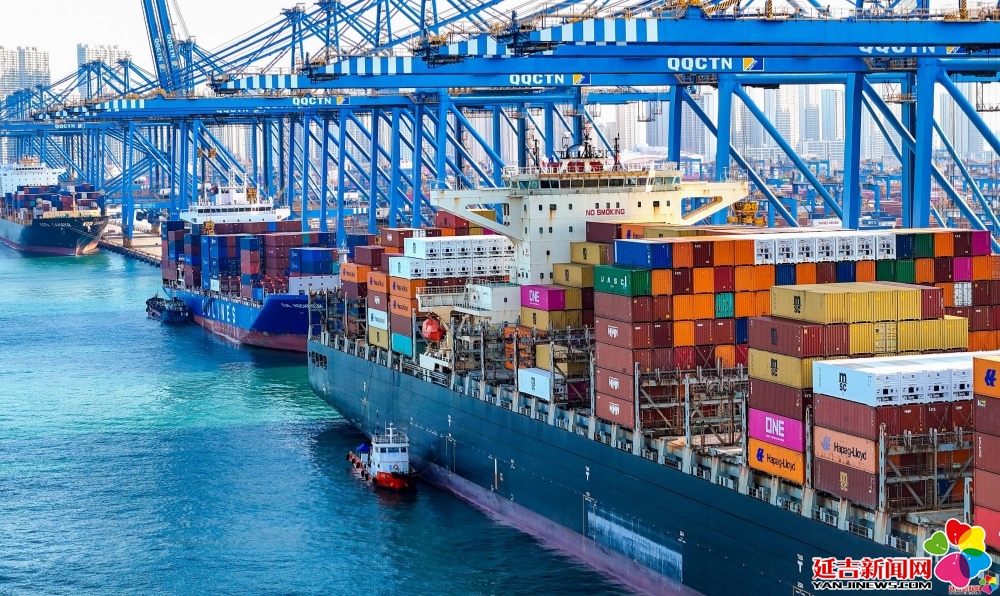 △货轮在山东港口青岛港全自动化码头装卸货物。