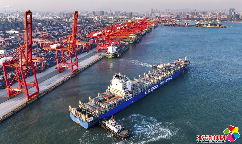 2025年12月5日,在山东港口日照港集装箱码头,满载集装箱的船舶驶离港口(无人机照片)。新华社发(李大伟摄)