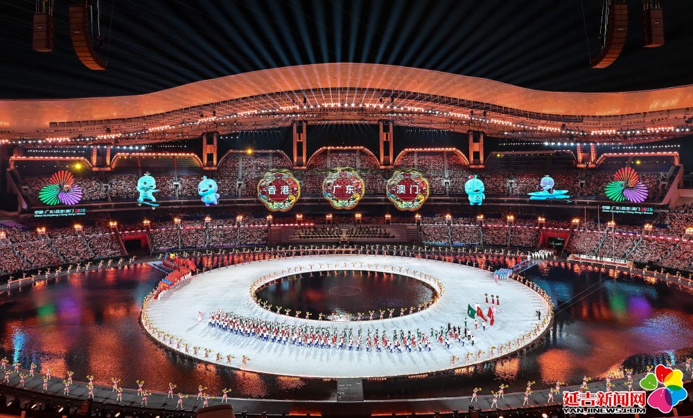 2025年11月9日,第十五届全国运动会开幕式在广东奥林匹克体育中心举行。这是广东省体育代表团、香港特别行政区体育代表团和澳门特别行政区体育代表团在入场仪式上共同入场。新华社记者 李鑫 摄