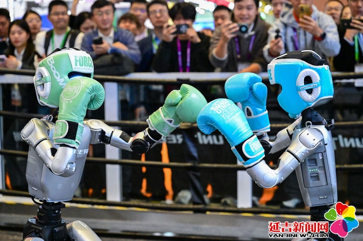 2025年11月6日,在第八届进博会宇树科技展台,人形机器人进行格斗表演。新华社记者 蔡湘鑫 摄