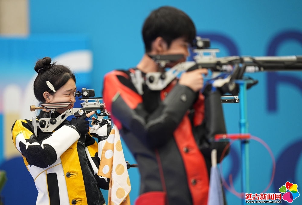 2024年7月27日,中国选手黄雨婷(左)/盛李豪在巴黎奥运会射击10米气步枪混合团体决赛中夺冠,赢得巴黎奥运会首枚金牌。新华社记者 鞠焕宗 摄