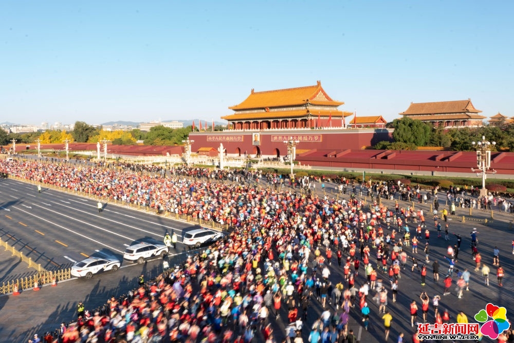 2025年11月2日,北京马拉松参赛选手在比赛中经过天安门广场。新华社记者 谢晗 摄