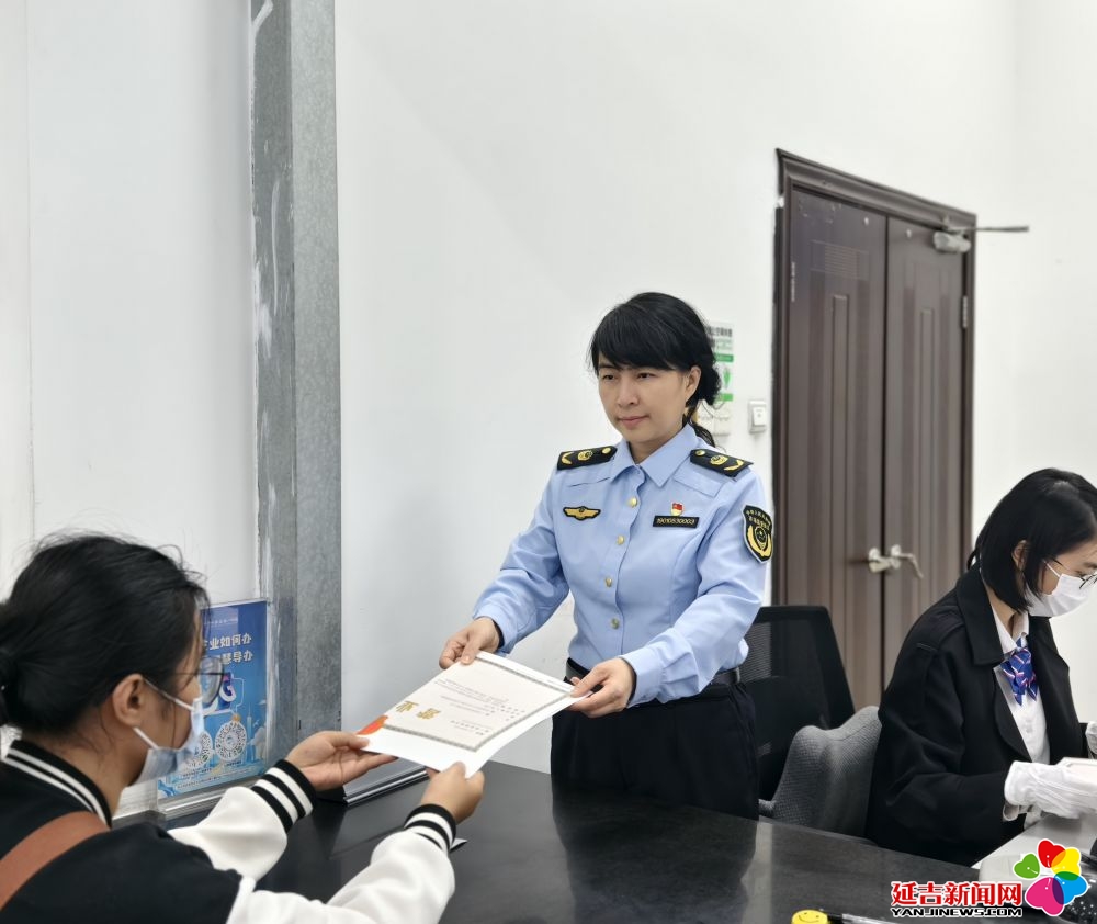 2026年2月6日,广州白云区市场监管局副局长孔丽雅(中)在帮助市民办理营业执照。(受访者供图)