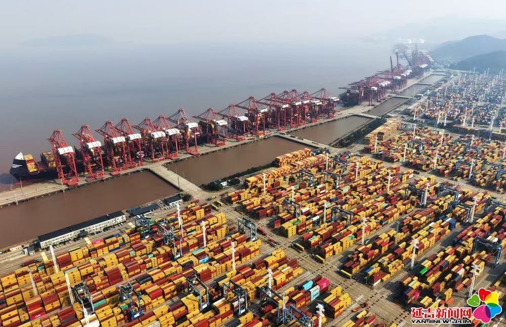 浙江宁波舟山港梅山港区,巨轮穿梭不息,起重机臂展如龙,一派繁忙景象。